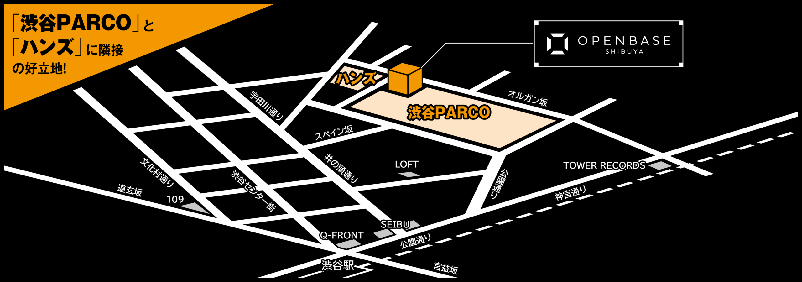 多くの方が行き交う、渋谷パルコとハンズ渋谷が並ぶ通り沿いのポスター枠です。